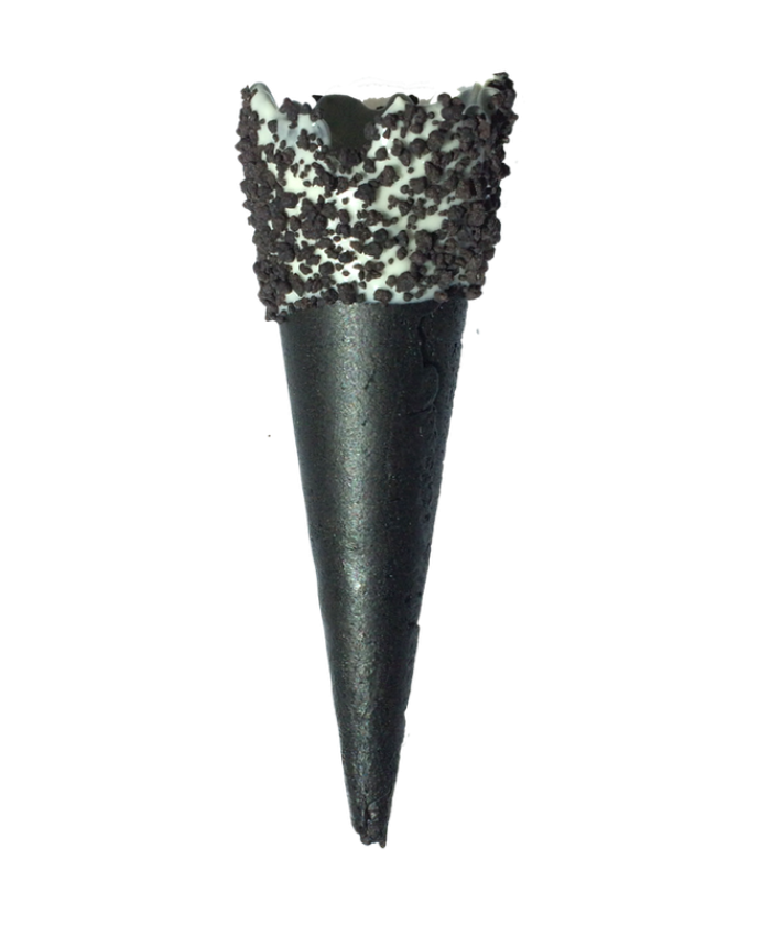 A new twist on the Antonelli Black Smoothy® Twist®. This black waffle cone is dipped in white chocolate then rolled in black cookie crumbs.
