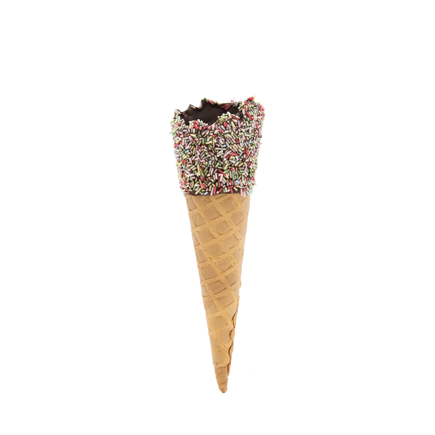 The Atina Fun is a small 1 scoop waffle cone, with rainbow coloured sugar strand decoration on a dark chocolate coating (NB all our sugar strands are AZO free). Only available to collect or delivered as part of a “Pallet Order” as this is a “Fragile” item.