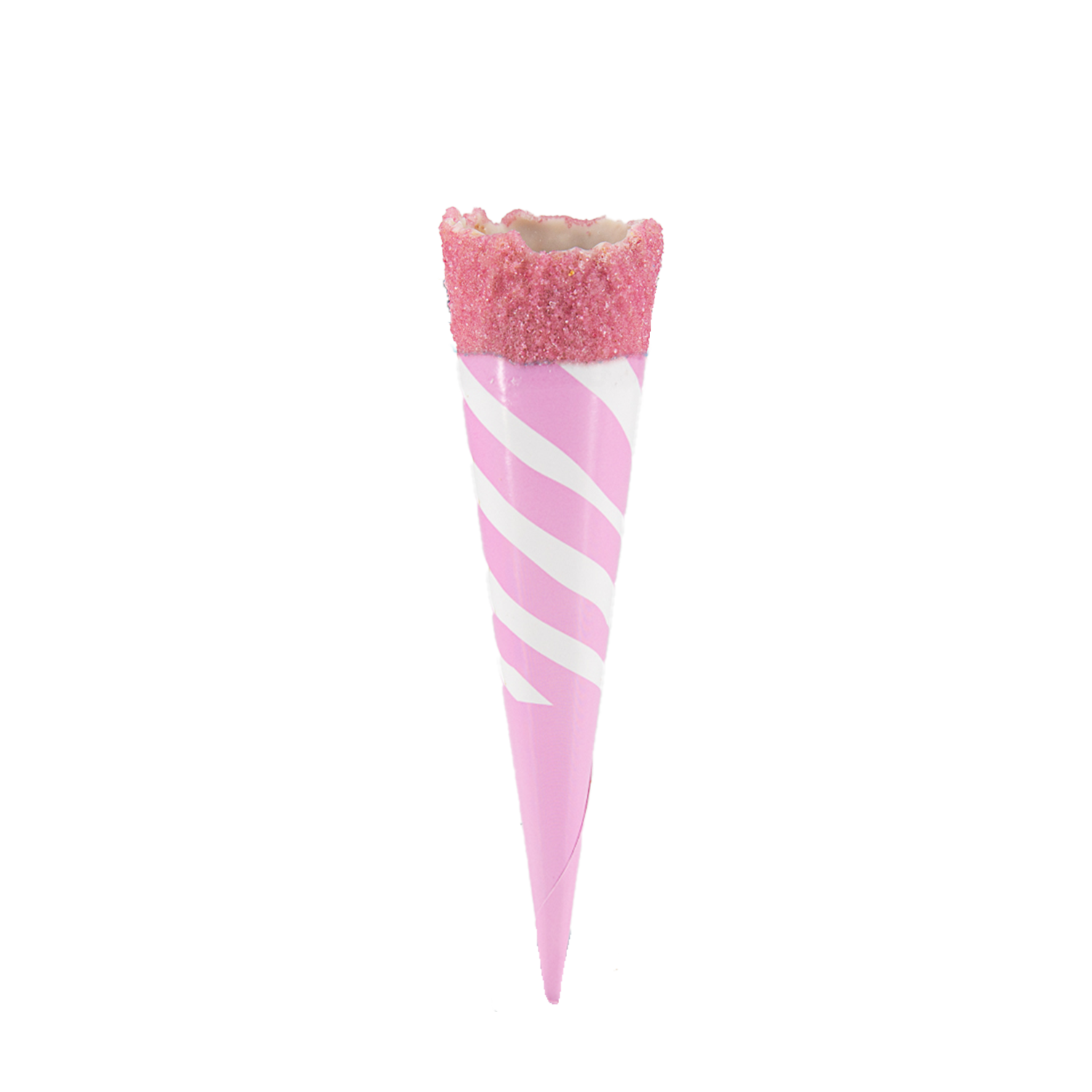 The Atina Cotton Candy Pink & White Sleeved is a small 1 scoop waffle cone, with pink sugar decoration on a white chocolate coating (NB all our sugar is AZO free), with a short pink & white sleeve. Only available to collect or delivered as part of a “Pallet Order” as this is a “Fragile” item.