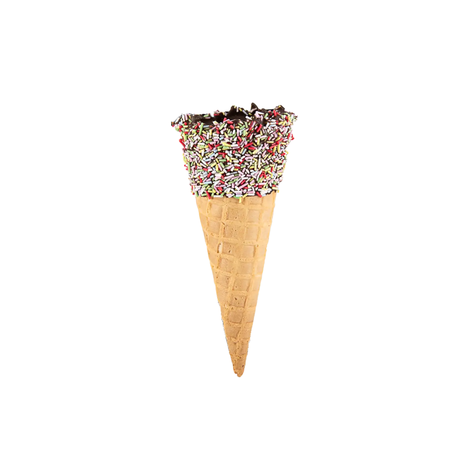 The Double Sugar Fun is a large 2 scoop sugar cone, with rainbow coloured sugar strand decoration on a dark chocolate coating (NB all our sugar strands are AZO free). Only available to collect or delivered as part of a “Pallet Order” as this is a “Fragile” item.
