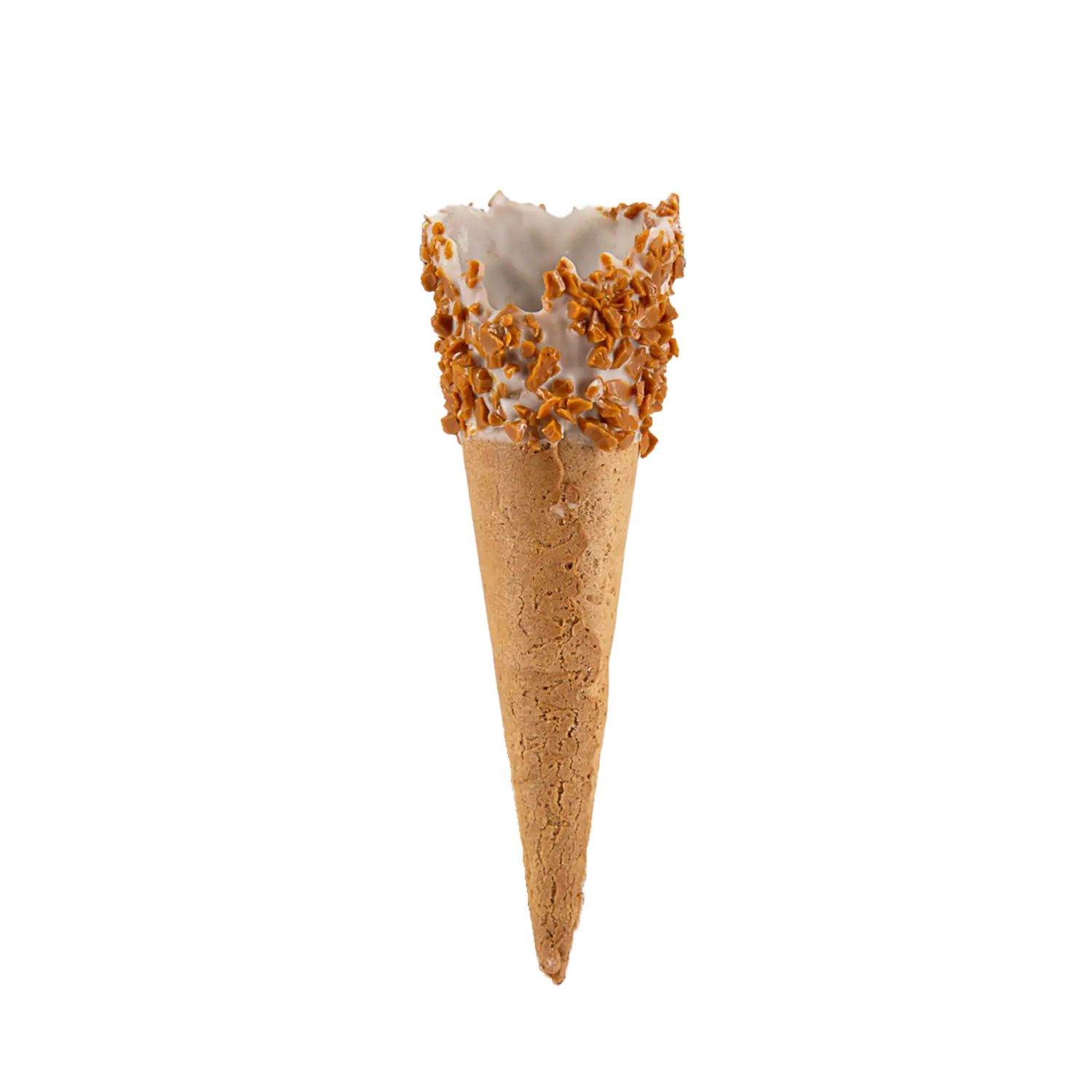 The Smoothy® Highball Caramel is a tall smooth 1+ scoop waffle cone, with a salted caramel pieces decoration on a white chocolate coating. Only available to collect or delivered as part of a “Pallet Order” as this is a “Fragile” item.