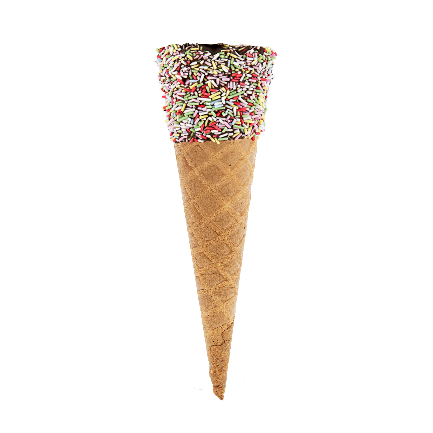 The Tall Sugar Fun is a tall 1 scoop sugar cone, with rainbow coloured sugar strand decoration on a dark chocolate coating (NB all our sugar strands are AZO free). Only available to collect or delivered as part of a “Pallet Order” as this is a “Fragile” item.